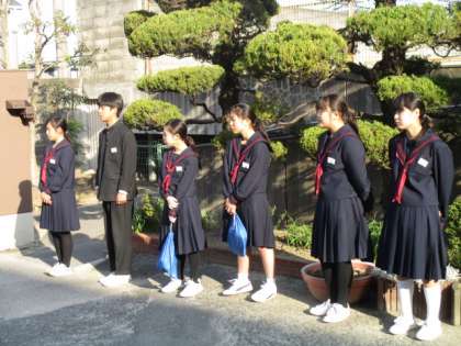 今日は3年生が登校する最終日なので、バレーボール部が3年生を待っていて、最後のお礼の挨拶と品物を渡していました。生徒会役員、地域の方もりがとうございます。