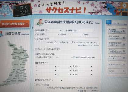 大阪府教育委員会では、パソコンやスマートフォン等を使って、学校の所在地や設置学科、部活動等の希望する条件に合う学校を簡単に検索することができる「さくっと検索!サクセスナビ!」(愛称『咲くなび』)を開設しています。