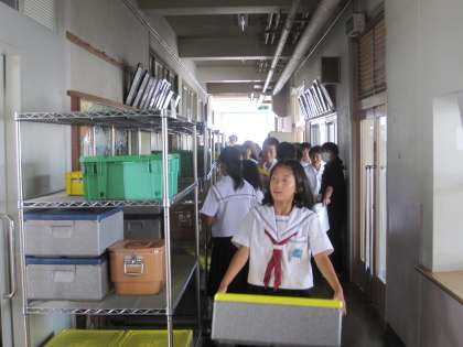 本日の給食には初めて食缶(スープ)が登場して、当番生徒の人数も増えていますが、スムーズに配膳が進んでいます。谷中生、あっぱれです。