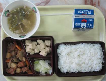 献立はごはん、酢豚、高野豆腐の含め煮、キャベツのソテー、レタススープ、牛乳です。