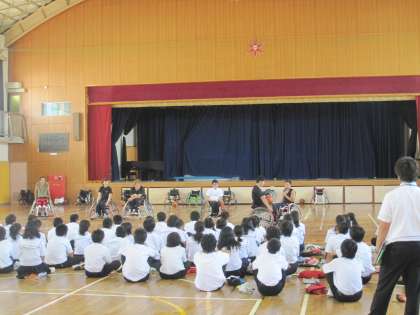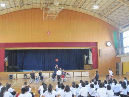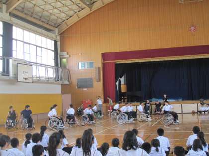 車いすバスケットボールチーム「大阪イーグルス」の皆さんが来校してくださり、お話を伺ったり、ゲームを見学させていただいたり、そして実際にゲームに参加をして体験することもできました。