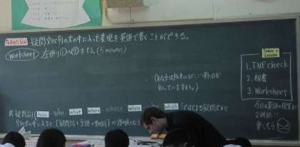 黒板には「本時のめあて(目標)」「授業の流れ」が明示されています。