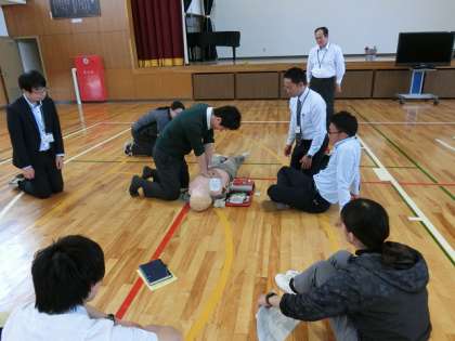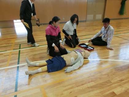 中間テストで子どもたちのいない午後の時間帯を利用して、「救急救命講習」を行いました。
