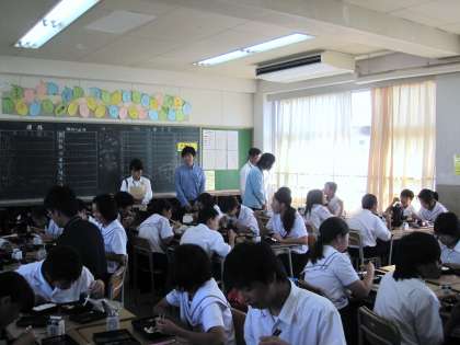大東市教育委員会の方からの説明とともに、配膳や給食時間、片付けの様子などを視察されました。