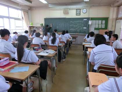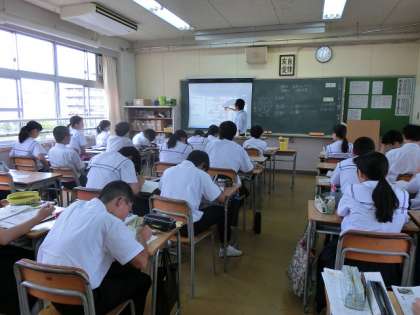 国語は、「用言(動詞・形容詞・形容動詞)の活用形の授業をしていました。高校に進学して国語の単位修得の壁になるのがこの文法です。今基礎をしっかり学んでおかないと生けません。がんばれ!