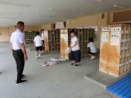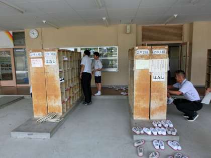 台風の影響で、生徒用の下足室の下足ロッカーが倒れる被害が出ていました。