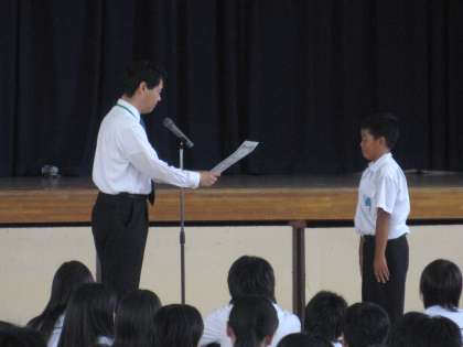 本日の生徒集会では男子バスケットボール部(市大会・準優勝)、サッカー部(市1年生大会・第3位)の表彰がありました。