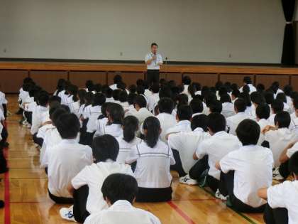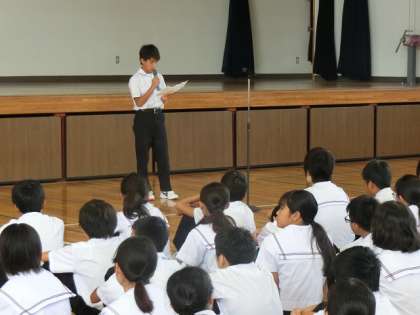 校長の話(学校だより第9号に記載する予定)の後、選挙管理委員会から後期生徒会役員選挙公示と週末の選挙のお知らせがありました。