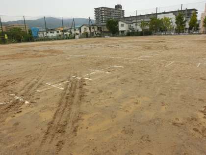 昨日、多くの先生たちで協力して引いた白線が雨に濡れて少しばかりぼやけていました。