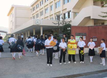 生徒会による挨拶運動、エコキャップ回収とあわせて行われています。