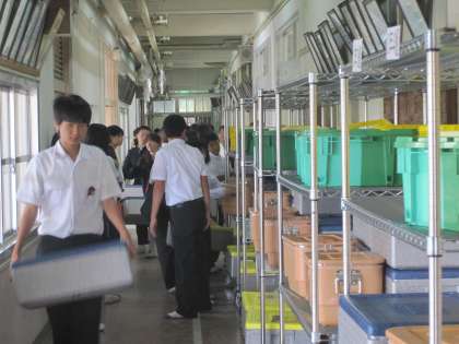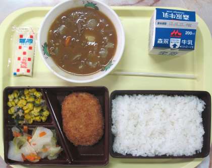 今日の献立は白ごはん、おからコロッケ、コーンソテー、ボイル野菜、マヨネーズ、カレーシチュー、牛乳です。