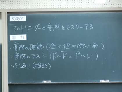 教室の後ろに張り出されているアルトリコーダー音階図を見ながら練習をする生徒もいました。