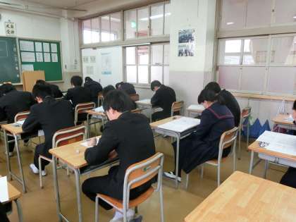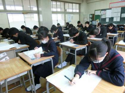 英語のリスニングテストを受けながら、真剣に考えている様子です。