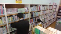 好きな本を手に取り、静かに読んでいます。貸し出しカウンターでは、3年生の図書委員...