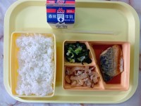 今日のメニューは、白ごはん、鯖のみそ煮、豚肉と大根の煮物、おひたし、牛乳です。鯖...